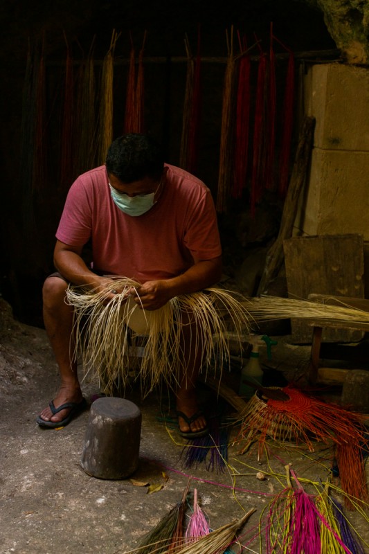 These handicrafts are woven in caves, due to the humidity that is stored in them, since this favors the raw material to remain flexible at the time of weaving, otherwise the material dries up and breaks; Another very important fact is that the natural material is light beige in color and to give it color it is dyed with a natural dye based on bark, leaves or roots. For more details in my story.
